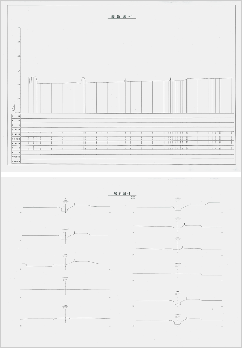 道路の建設や宅地造成開発の測量設計を行います。 ノンプリズムと携帯測量システムを使用し人が行けない急斜面の縦横断測量が可能になり、計算処理(内業)の時間大幅に短縮し図面を素早くお渡しできます。